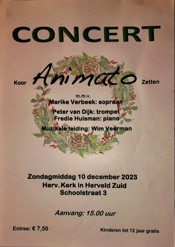 Het koor Animato uit Zetten geeft weer een Concert in de Herv. Kerk in Herveld Zuid. Samen met de sopraan Marike Verbeek en de trompettist Peter van Dijk belooft het een mooie concertmiddag te worden. De pianobegeleiding is in handen van Fredie Huisman.