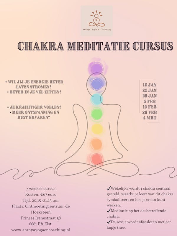 In de Cursus Chakra meditatie leer je in 7 lesavonden wat de 7 hoofdchakra’s betekenen en gaan we door middel van meditatie de stroom van je levensenergie in je lichaam herstellen