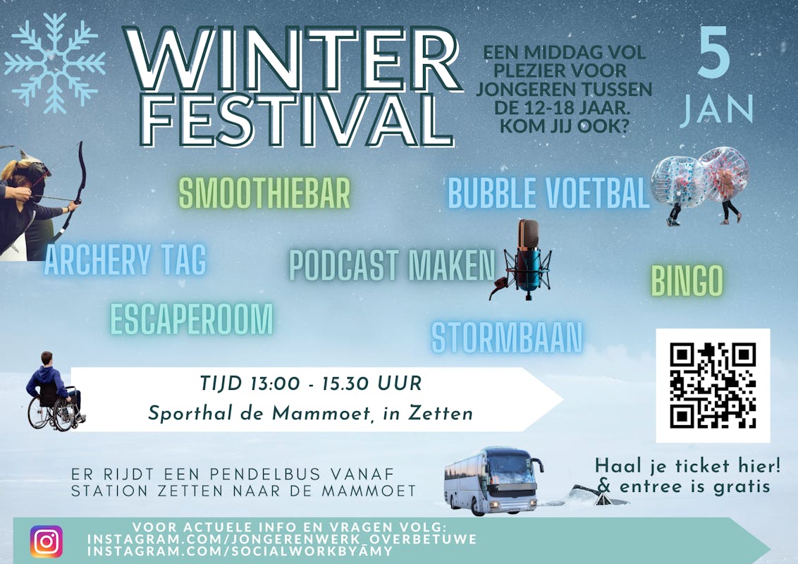 Voor jongeren tussen de 12-18 jaar is er op 5 januari een Winterfestival georganiseerd! De hele sporthal is gevuld met toffe activiteiten. Altijd al onderdeel willen zijn van een podcast? Dat kan tijdens het Winterfestival! Een potje bubbelvoetbal doen? Archery Tag, Bingo en quizen? Alles kan op vrijdag 5 januari!