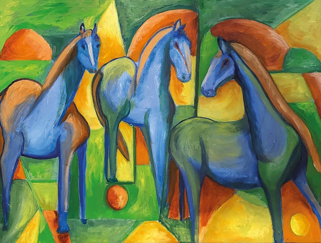 Dieneke van Silfhout wil haar speelsheid in paarden tot uitdrukking brengen. Haar paarden op doek en van keramiek zijn gestileerd en kleurrijk.