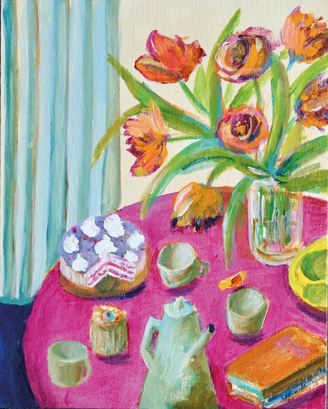 De stillevens van Rieneke Metselaar stralen met hun heldere kleuren en diverse patronen een levendig en dynamisch karakter uit. In deze reeks nemen tulpen een prominente plaats in.