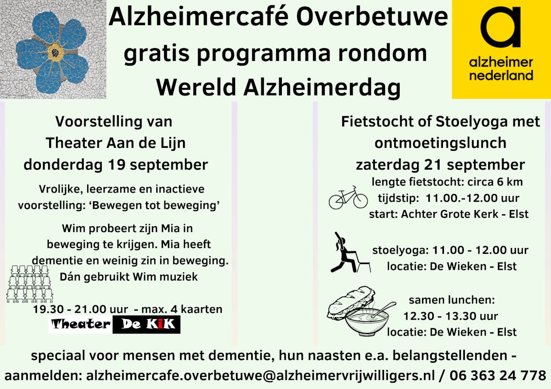 OVERBETUWE – Het Alzheimercafé Overbetuwe organiseert rondom Wereld Alzheimerdag met het thema ‘Samen in beweging’, een extra gratis programma, speciaal voor mensen met dementie en hun naasten. Mogelijk gemaakt door de vele Overbetuwe Doet-cheques.