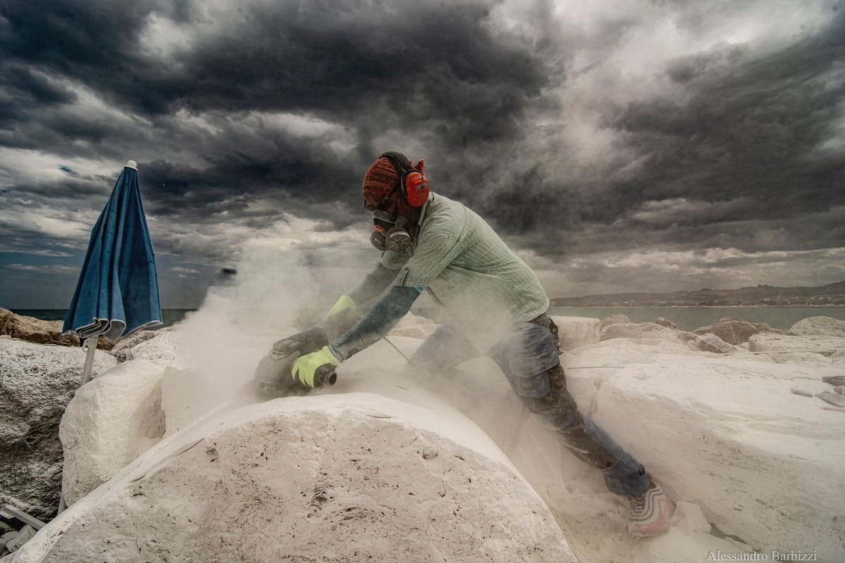 De deelnemende beeldhouwers maken in iets meer dan twee weken een levensgroot beeld uit Belgisch hardsteen.