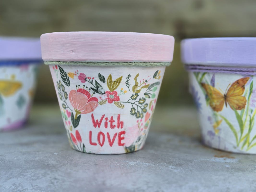 Decoupage met servetten is een leuke en creatieve manier om je huis op te fleuren. De servettentechniek kun je toepassen op heel veel materialen zoals, hout, karton, dakpannen, bloempotten, glas, blik, tegels, etc. In deze creatieve workshop ga je twee bloempotten decoreren. Deze workshop geeft je de mogelijkheid om het op eenvoudige manier uit te proberen.