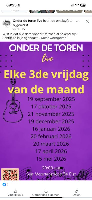 Elke 3de vrijdag van de maand 3 bands die belangeloos spelen in zalencentrum onder de toren in elst Sintmaartenstraat 34 elst... Lees meer