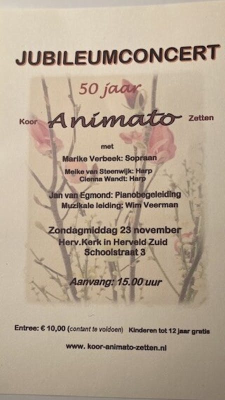 Op zondagmiddag 23 november viert het koor Animato uit Zetten haar 50-jarig bestaan met een Jubileumconcert in de sfeervolle Herv. Kerk in Herveld Zuid waaraan de bekende sopraan Marike Verbeek en de jonge en getalenteerde harpistes Meike van Steenwijk en Cienna Wandt hun medewerking aan verlenen. Voor dit concert nodigen wij u van harte uit!