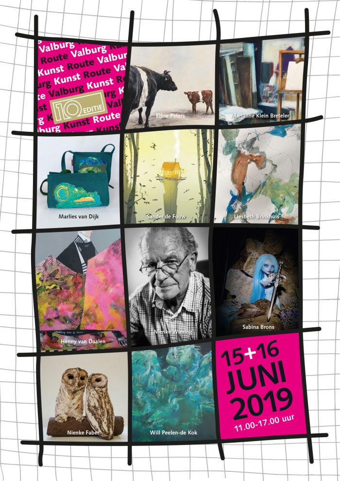 Op zaterdag 15 juni en zondag 16 juni 2019 wordt voor de 10e maal de Kunstroute Valburg gehouden. Dit jaar stellen 10 kunstenaars hun tuin en/of atelier open en tonen schilderijen, grafiek, tekeningen, foto’s, keramiek en textiele werken.