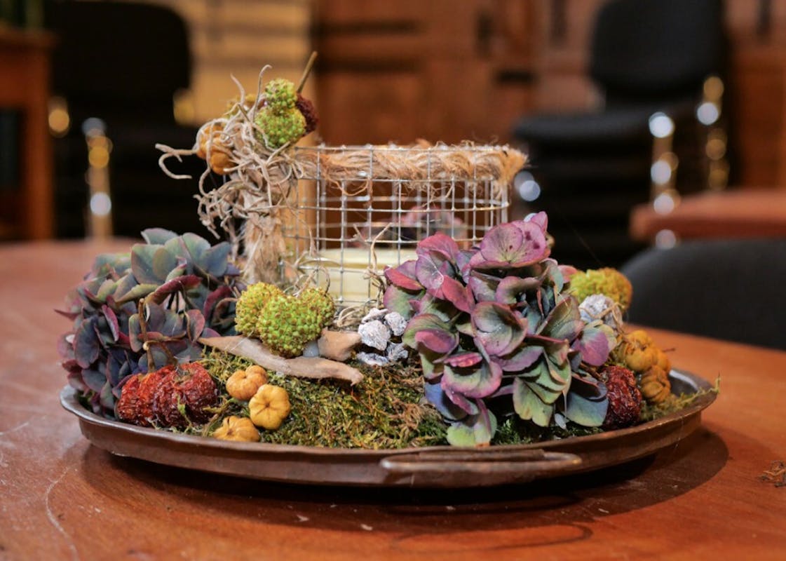 Onder het genot van een kopje koffie met vers gebakken appelflap en een drankje maakt u een mooi herfststuk.