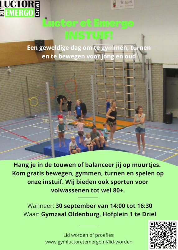 Vrijblijvend en gratis lekker spelen, bewegen, gymmen en turnen. Op deze dag kan je ervaren of dit een leuke sport is. Wij geven ook sportlessen voor volwassenen, zoals Sport, Fit & Spel en Seniorengym. Kom kijken en als je zin hebt, lekker meedoen.