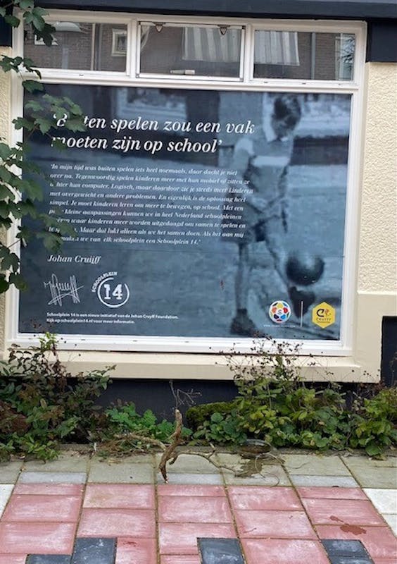 Gisteren was ik met vrienden aan het hardlopen in Amsterdam. We kwamen langs het geboortehuis van Johan Cruijff. Deze mooie tekst staat daar op het raam: “Buitenspelen zou een vak moeten zijn op school”