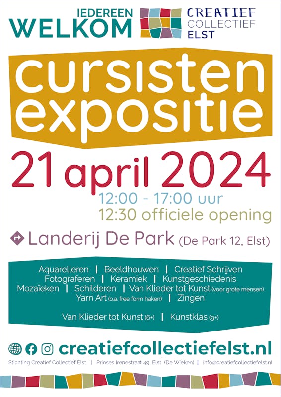 Zondag 21 april is het weer zo ver, dan tonen de cursisten van Creatief Collectief Elst (CCE) hun werkstukken. Omdat er afgelopen jaar meer cursussen en workshops werden gegeven dan ooit, is ook de variatie in de werkstukken groter dan ooit. Naast schilderen, aquarel, beeldhouwen, keramiek en mozaïek, zijn er deze keer ook foto's, werkstukken van de kindercursissen en de workshops Yarn Art te zien. De docent kunstgeschiedenis geeft er informatie over haar cursus van het komend lesjaar.