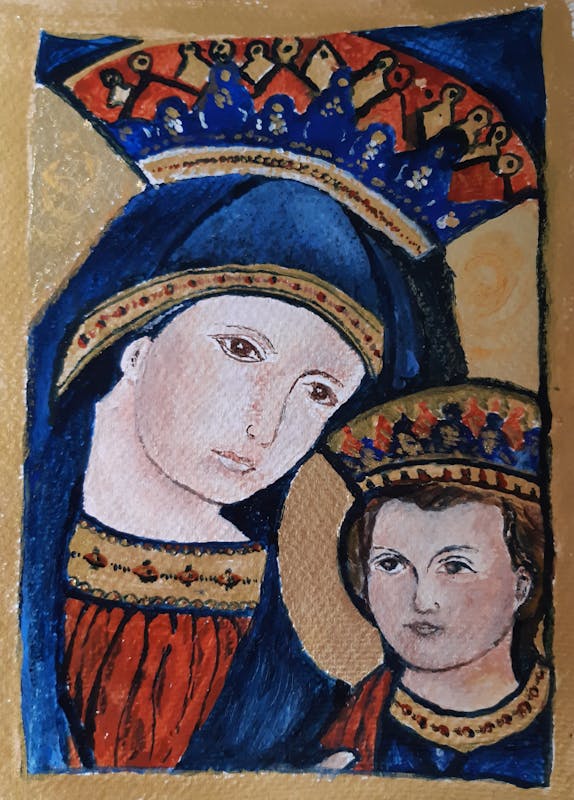 Het tweede en meer praktisch ingerichte deel van de cursus duurt twee uur en wordt verzorgd door zijn moeder Joke van Hoeven. Zij geeft aquarelles bij CCE en is als basisschoolleerkracht ‘van alle markten thuis’. Bij haar ga je kleine werkstukken maken die in het verlengde liggen van wat Arno eerder vertelde. Daarbij staat niet het resultaat maar de ervaring voorop. In drie lessen ga je respectievelijk schilderen, een reliëf in klei maken en een icoon op aquarelpapier.