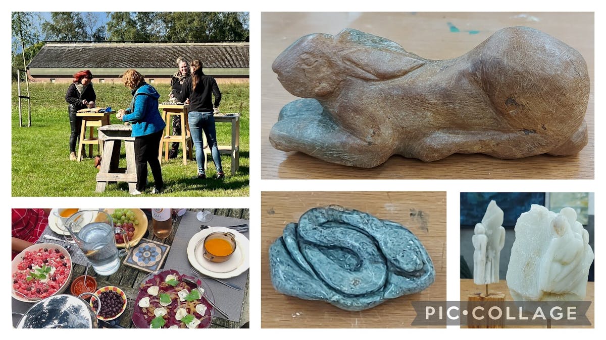 Voor koffie, thee, taart en een heerlijke mediterrane lunch wordt gezorgd. Ook krijg je alle materialen en gereedschappen tot je beschikking, die nodig zijn voor het maken van een beeld. Zelf hoef je dus niets mee te brengen, behalve een gezonde dosis enthousiasme. Als het even kan, werken we buiten in de boomgaard of op het veld achter de boerderij.
