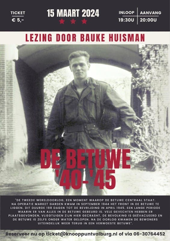 Lezing door Bauke Huisman over de Betuwe '40-'45. In de tweede wereldoorlog waarop er een moment is dat de Betuwe centraal staat.