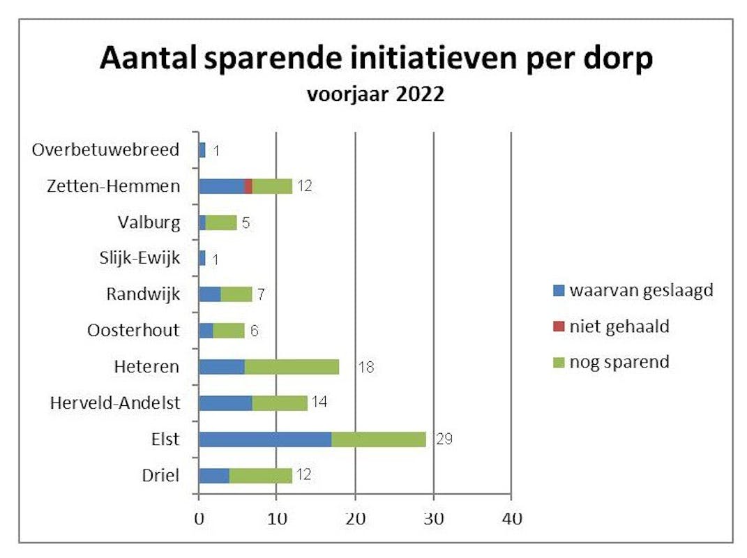 Deze ronde hebben 45 initiatieven voldoende gespaard! Zij kunnen hun initiatief gaan uitvoeren of hebben dit al gedaan. Buurten worden opgefleurd met bomen, vaste planten, bloembollen en nestkasten. Er worden weer gezellige ontmoetingen en activiteiten georganiseerd, zoals huiskamerconcerten, sporten samen met straat/buurtgenoten en de eerste inzet van de EHBO pop in Elst.