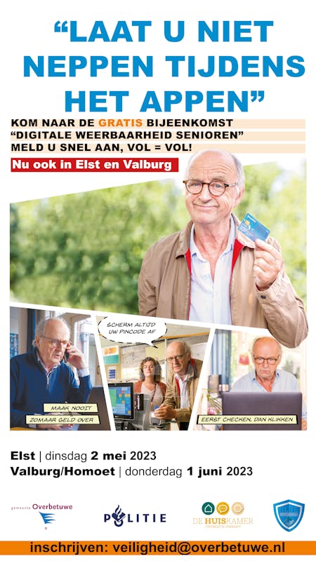 De gemeente Overbetuwe organiseert samen met politie, Bleu professionals en de huiskamers van Elst de bijeenkomsten "Digitale Weerbaarheid Senioren".