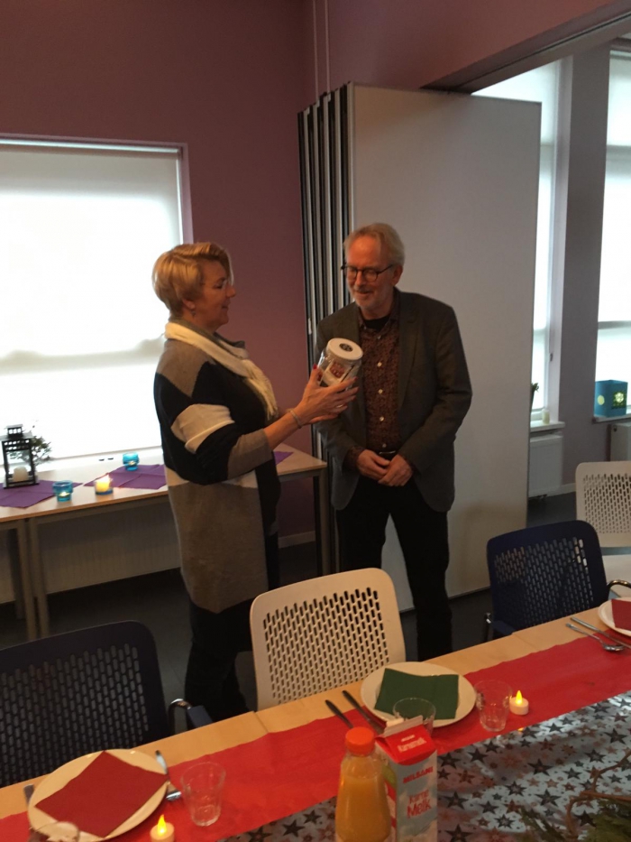 In december heeft Hester, onze buurtverbinder/voorzitter, een kletspot overhandigt aan Jeroen Jeroense, predikant in Elst, die de wekelijkse ´Stamtafel op vrijdag´ in de Ruimte bezielt.