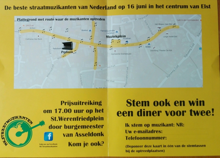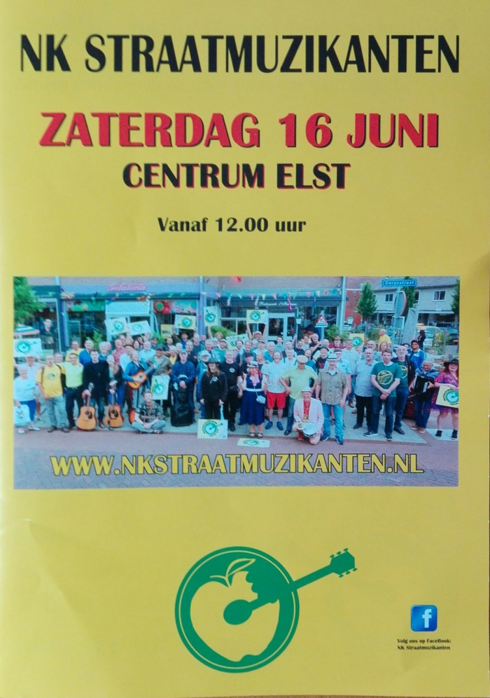 Ben jij muzikant, solo, in een duo of als band? En vind je het leuk om op te treden voor anderen? Dan is het NK Straatmuzikanten misschien wel iets voor jou! Het NK Straatmuzikanten in Elst is een jaarlijks muziek festijn, waarbij meerdere muzikanten verspreid door het centrum van Elst hun muziek kunnen laten horen voor alle bezoekers. Naast de gezelligheid maak je bovendien kans op de jaarlijkse hoofdprijs: De stenen Elstar Appel. Lijkt dit jou wel iets? Schrijf je dan nu alvast in voor het gezelligste muziek festijn van het jaar!