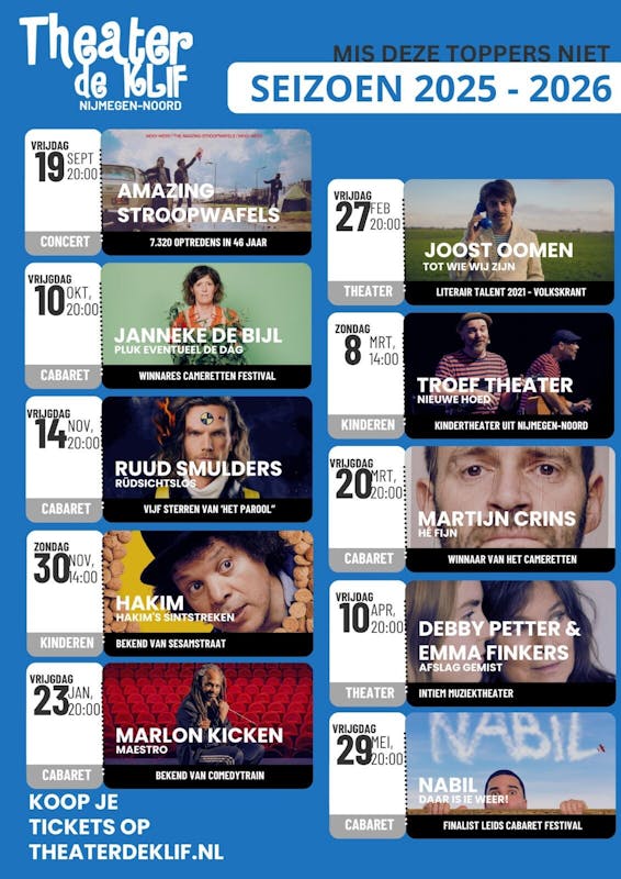 Theater De Klif is een kleinschalig theater in Nijmegen Noord. Theater De Klif biedt een gevarieerd programma voor het nieuwe seizoen. De verkoop is vanaf heden gestart: