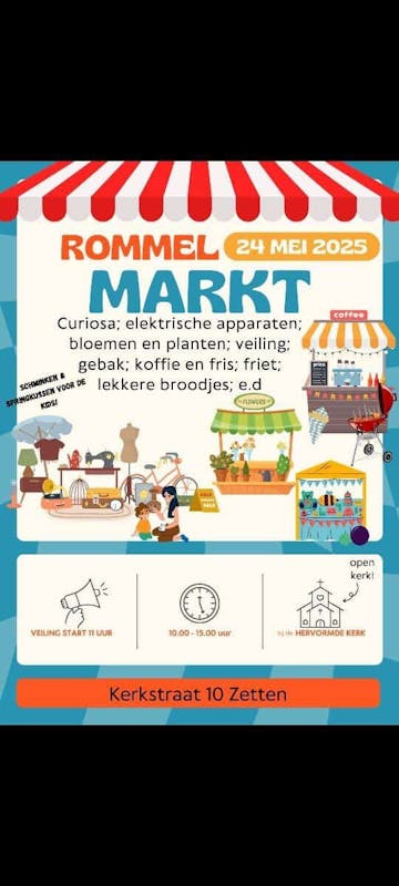 Op het kerkplein, aan de Kerkstraat in Zetten, wordt weer een gezellige lentefair/rommelmarkt gehouden op DV 24 mei van 10.00 tot 15.00 uur.