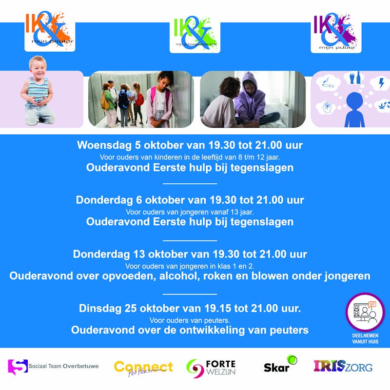 U bent van harte welkom bij de gratis online ouderavonden die we organiseren. We organiseren avonden voor ouders van peuters, schoolgaande kinderen (basisschoolleeftijd) en pubers. Op de website www.overbetuwe.nl/ouderavonden staat het actuele aanbod en kunt u zich aanmelden.