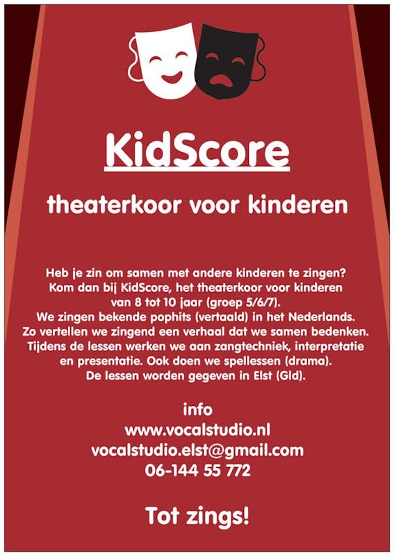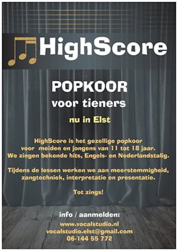 Houdt je kind van zingen? Kom dan naar de gratis proefles van theaterkoor KidScore (8-10 jr) of popkoor HighScore (11-18 jr).