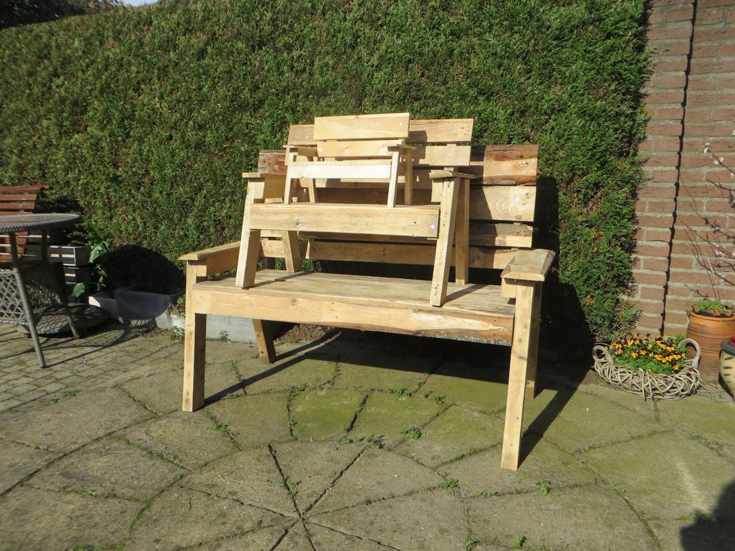Elk bankje ziet er weer anders uit, afhankelijk van de pallets die op dat moment beschikbaar zijn. Vanwege de afmeting alleen af te halen in Elst. De bankjes zijn (nog) niet behandeld of gebeitst. Meer informatie op: zaagzolder.nl.