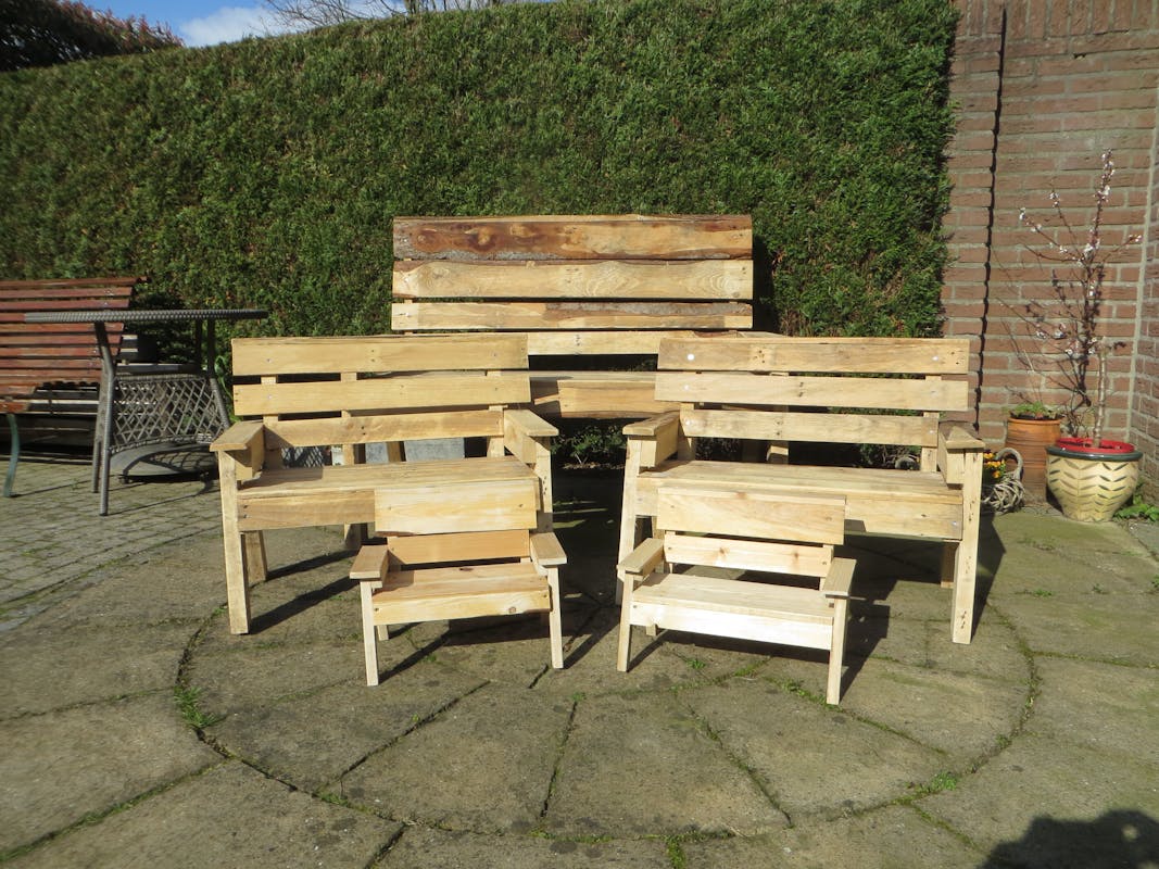 Unieke tuinbankjes op Zaagzolder! Gemaakt van hout afkomstig van oude pallets. Zitting en leuning zijn grondig geschuurd, dus geen risico’s op splinters. Er zijn 3 afmetingen: een 2-persoons bank circa 130 cm breed en 90 cm hoog, een kinderbankje van ca. 75 cm breed en 60 cm hoog én een poppenbankje van ca. 40 bij 30 cm.