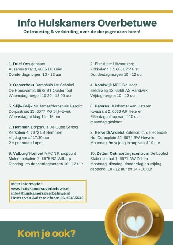 Hierbij een overzicht van de openingstijden van alle huiskamers in Overbetuwe.