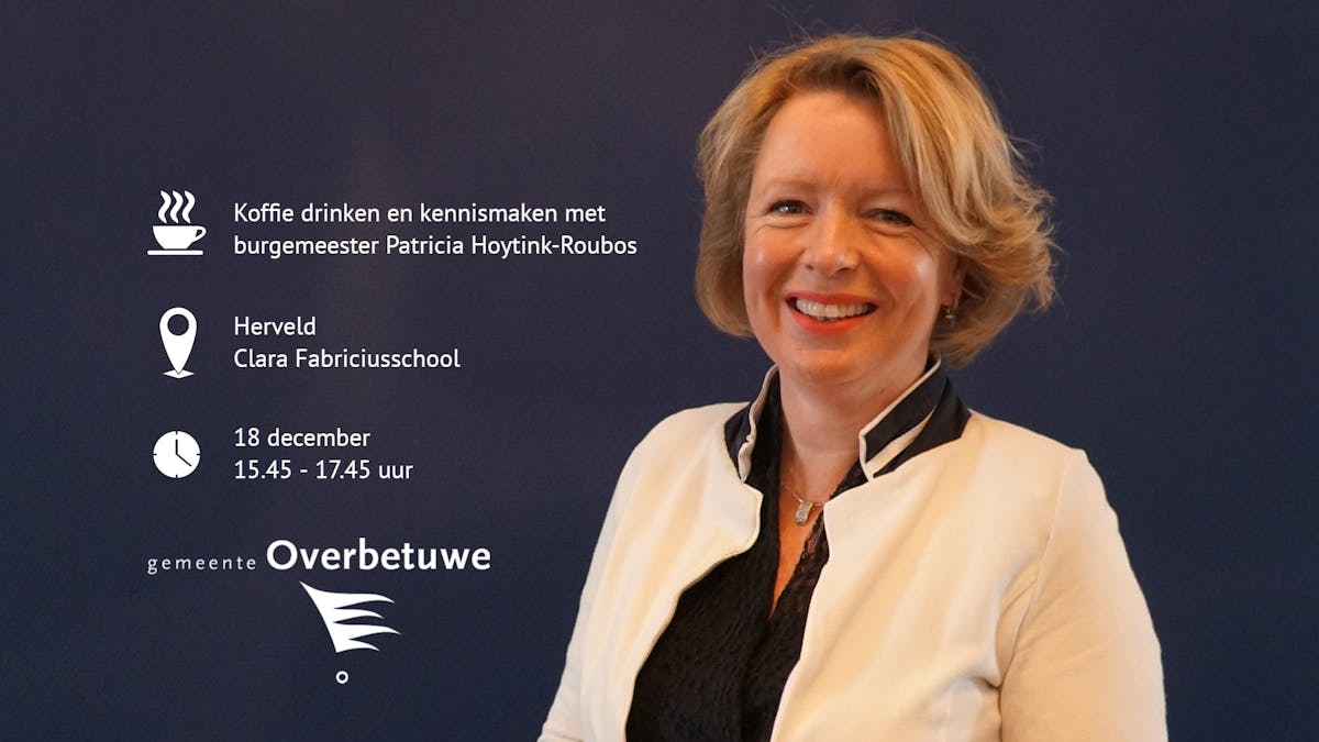 In haar eerste jaar als burgemeester, komt Patricia Hoytink-Roubos in alle dorpen langs om nader kennis te maken en koffie te drinken met inwoners. Na de geslaagde bezoeken in Randwijk, Valburg en Driel, komt de burgemeester op woensdag 18 december naar Herveld. Ze is die middag van 15.45 tot 17.45 uur in de Clara Fabriciusschool.