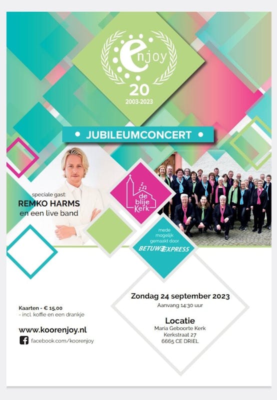 Koor Enjoy uit Driel bestaat 20 jaar! Het koor wordt al meer dan 7 jaar begeleid door dirigent Lex van Diepen en pianist Hans Grotenbreg.
