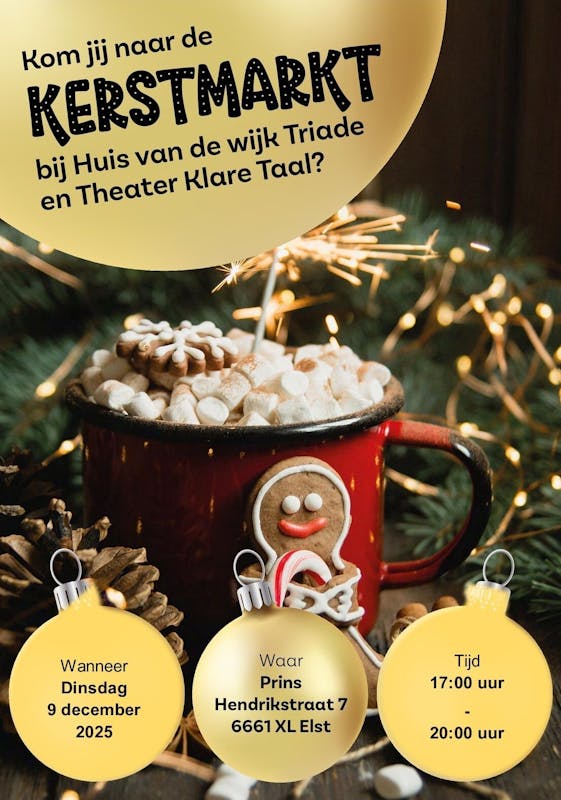 De donkere dagen voor kerst vragen om warmte en samenzijn — en waar kan dat beter dan bij onze jaarlijkse kerstmarkt? Op dinsdagavond 9 december van 17:00 tot 20:00 uur toveren we het Huis van de Wijk Triade weer om tot een sfeervol winterdorp vol geuren, geluiden en gezelligheid.