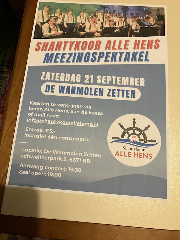 Op21 september verzorgt het Shanty Koor Alle Hens een meezingavond in de Wanmolen. Het zal de laatste grote samenkomst in de Wanmolen zijn voordat in het voorjaar van 2025 de Wanmolen wordt afgebroken. Een laatste mogelijkheid voor inwoners van Zetten e.o. om nog even het gebouw van binnen te zien, waar mogelijk ook veel herinneringen liggen.