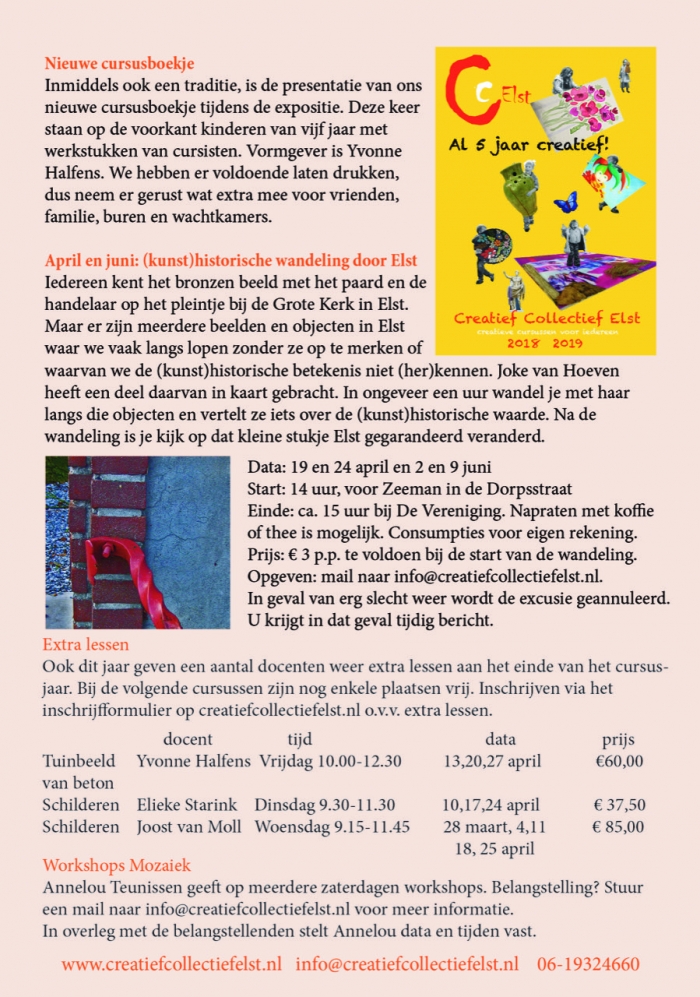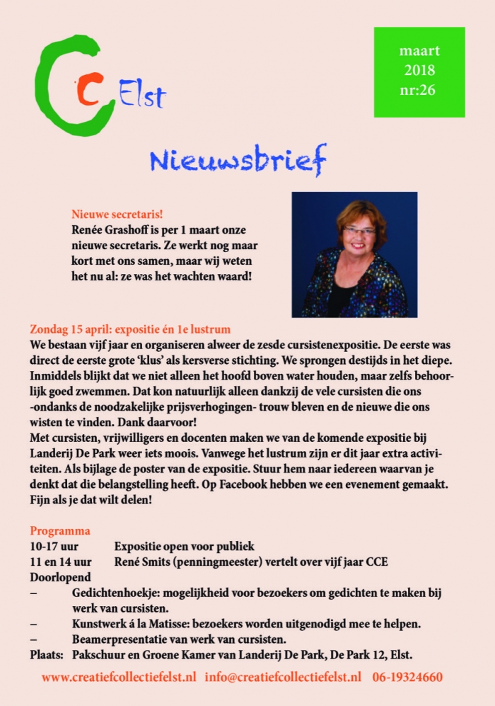 Het is algemeen bekend dat er bij het CCE beeldhouwlessen worden gegeven. Jarenlang zijn deze verzorgd door Els Mathijssen, maar zij gaat ons vanwege haar pensioen verlaten. Ge...