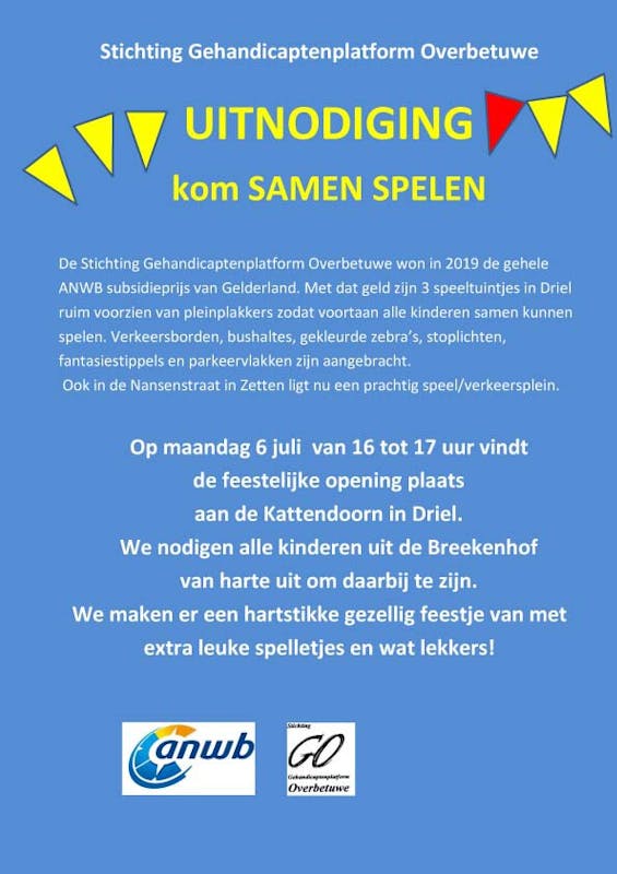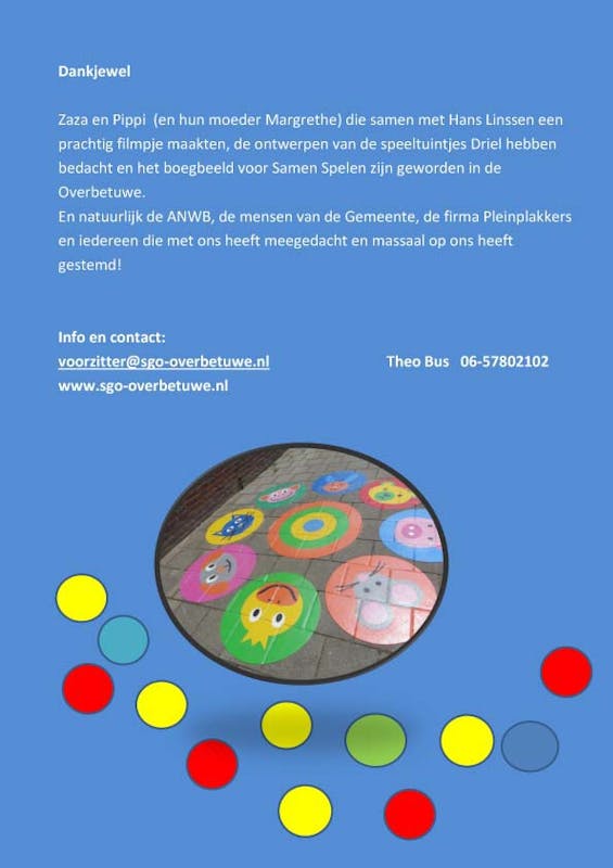 Met dat geld zijn de speeltuin aan de Nansenstraat in Zetten én de 3 speeltuinen aan de Breekenhof in Driel voorzien van veel fleurige speel- en verkeers-pleinplakkers. Nu kan iedereen, ook kinderen met een beperking, lekker spelen.
