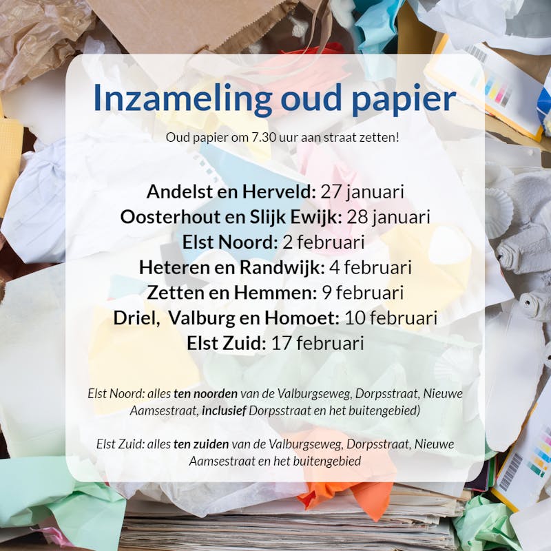 Let op: zet het oud papier om 7.30 uur aan straat. Het oud papier wordt overdag ingezameld.