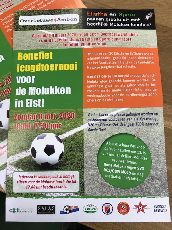 Eind februari vond een goed georganiseerde pubquiz plaats in het gebouw van de Stichting Maluku Elst, waaraan een groot aantal enthousiaste teams deelnam. De avond leverde bijna € 600 op voor het goede doel. En dan was er begin maart nog een benefiet jeugdvoetbaltoernooi op de velden van sportpark De Pas. Molukse jeugdspelers speelden tegen een elftal met spelers van Haïtiaanse afkomst in Nederland en jeugdelftallen van Spero en Elistha. De benefiet was goed voor bijna € 900. Na de wedstrijd vond in de kantine een veiling van gesigneerde voetbalshirts plaats. Het ging om shirts van De Graafschap, Vitesse, NEC en Feijenoord. Opbrengst voor de actie: € 600.