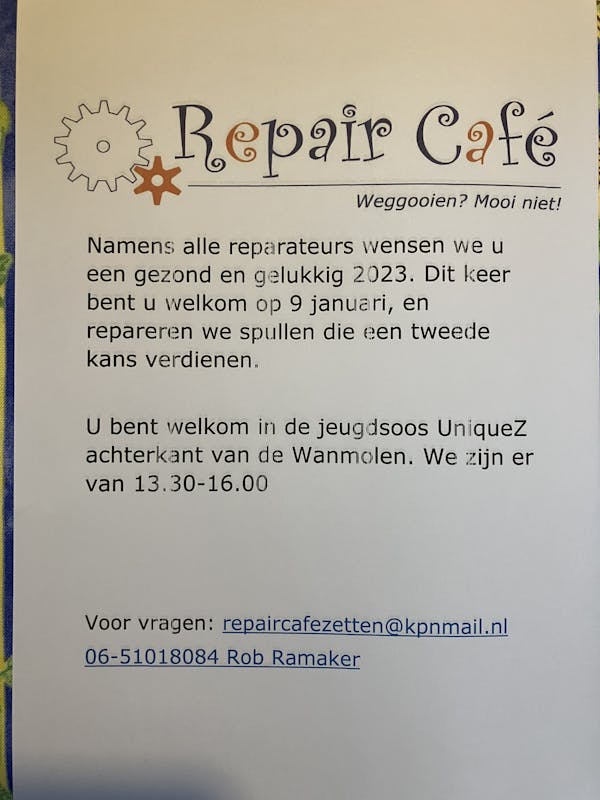 Nieuws over het RepairCafe Zetten Op 1 september gaan we weer van start, en staan de monteurs weer klaar voor reparaties Door de sloop van de Wanmolen is het Repaircafe verhu...