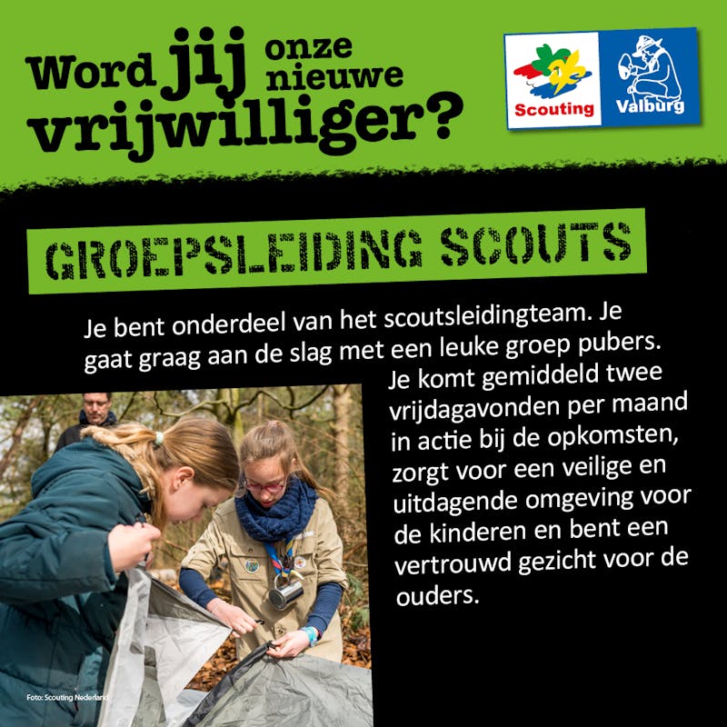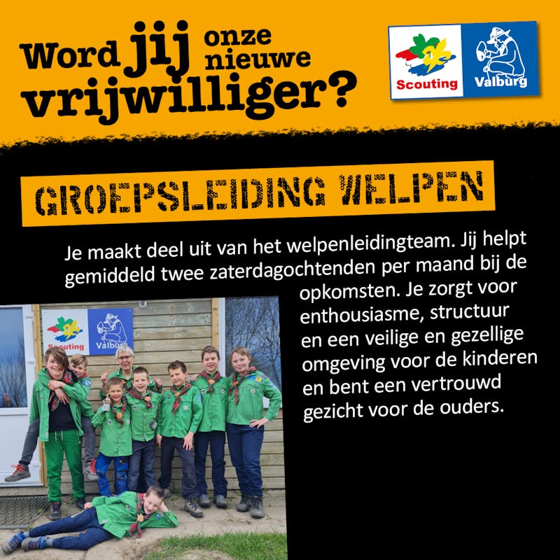 Scouting Valburg heeft voor zijn voortbestaan dringend nieuwe leiding nodig voor zowel de scouts (vrijdagavond) als de welpen (zaterdagochtend). Vind je het leuk om leerzame, s...
