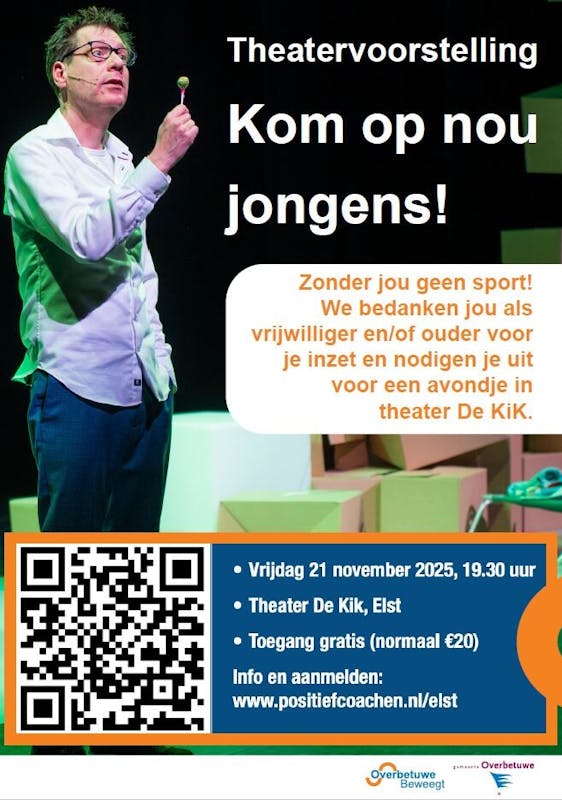 Op vrijdagavond 21 november 2025 organiseren Gemeente Overbetuwe en Overbetuwe Beweegt de humoristische theatervoorstelling 'Kom op nou jongens!' speciaal voor alle sportvrijwilligers uit Overbetuwe.