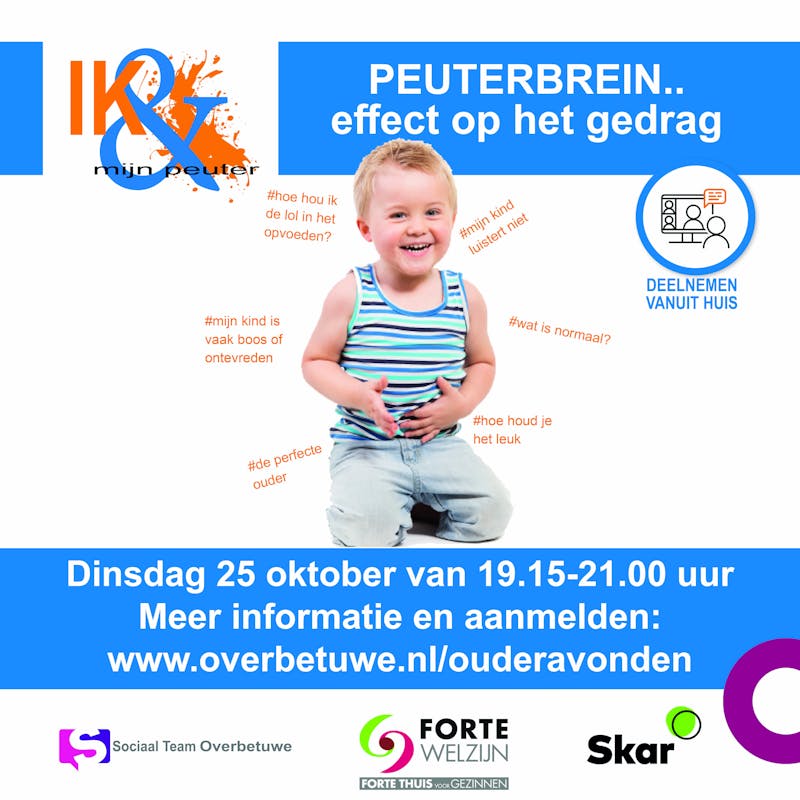 Bij het opvoeden van (jonge) kinderen kunt u soms tegen best wat problemen aanlopen. We bieden ouders/verzorgers hierin graag hulp. De peuterfase is een periode waarin uw kind soms erg tegendraads kan zijn. We geven u tijdens deze ouderavond een kijkje in het peuterbrein. Waarom vertonen peuters soms erg lastig gedrag en hoe kunt u daarmee omgaan?