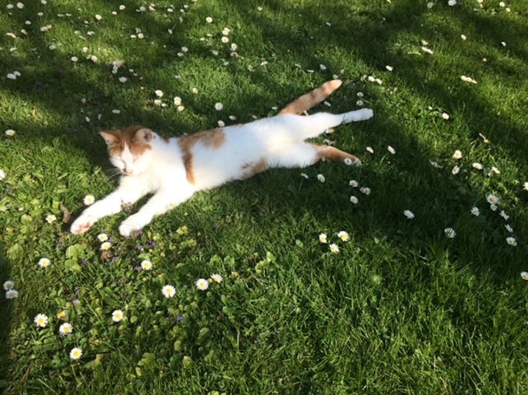 ’s Middags halen we haar uit de doos en leggen haar op het gras om haar te aaien, ze ziet er nog zo mooi, zo jong, uit! We bedanken haar voor alles wat ze voor ons betekent heeft: haar warmte, haar speelsheid, haar rust, haar moed (ze zoogde haar kittens terwijl ze een flink litteken had van de keizersnee waaruit Joy gehaald werd). We begraven haar in haar tuin met bloemen en een kaars.