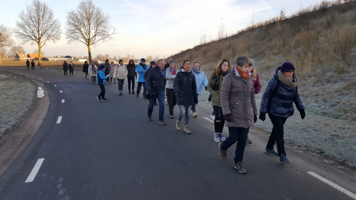 Deze ochtend beide groepen gezamenlijk 7 kilometer gewandeld door de Waalstraat via de Dijkstraat, waar we het opkikkertje genuttigd hebben en Kerkepad (bij sommige niet bekend) weer terug naar Snackpoint 't Smulhoekje.