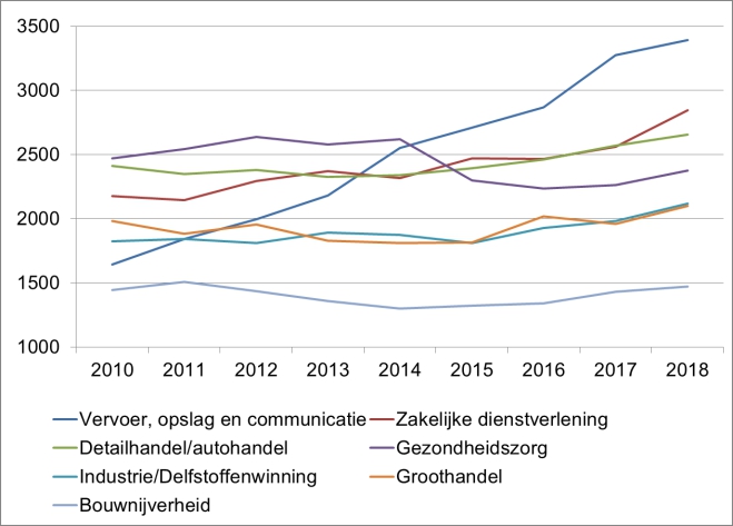 De grootste groei van het aantal vestigingen vond plaats in de sector gezondheidszorg. Er kwamen 32 vestigingen bij. Het aantal banen nam toe met 113, in tegenstelling tot de (grote) daling van de werkgelegenheid in 2015 en 2016. In de sector met de meest vestigingen, zakelijke dienstverlening, nam het aantal vestigingen toe met 20 (in 2018 bijna 1.100 vestigingen). Het aantal banen in deze sector (met de grootste groei van de werkgelegenheid) nam toe met 284.