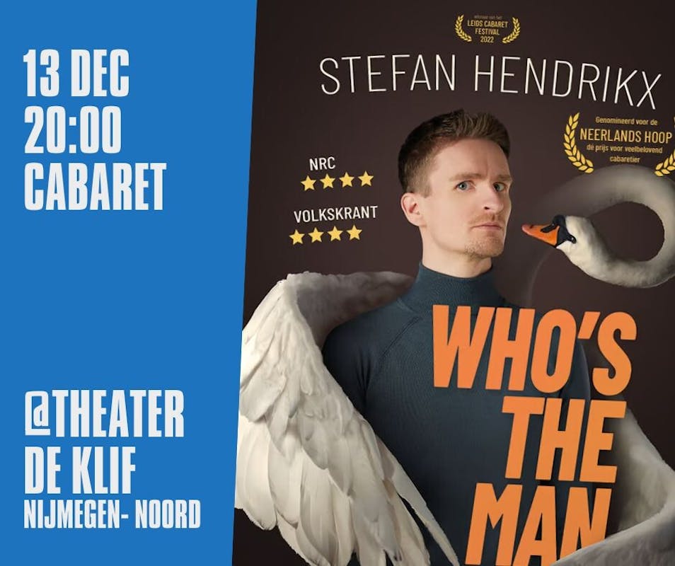 Stefan Hendrikx, winnaar van het Leids Cabaretfestival, staat op het podium in *Theater De Klif* op *13 december om 20:00*! π€β¨ Deze cabaretier, genomineerd voor Neerlands Hoop en overladen met ββββ-recensies, neemt je mee in zijn zoektocht naar de man in zichzelf: op dates, bij de familiebarbecue, dansend, zingend... Maar durft hij Γ©cht te staan voor wie hij is? π€πΆ