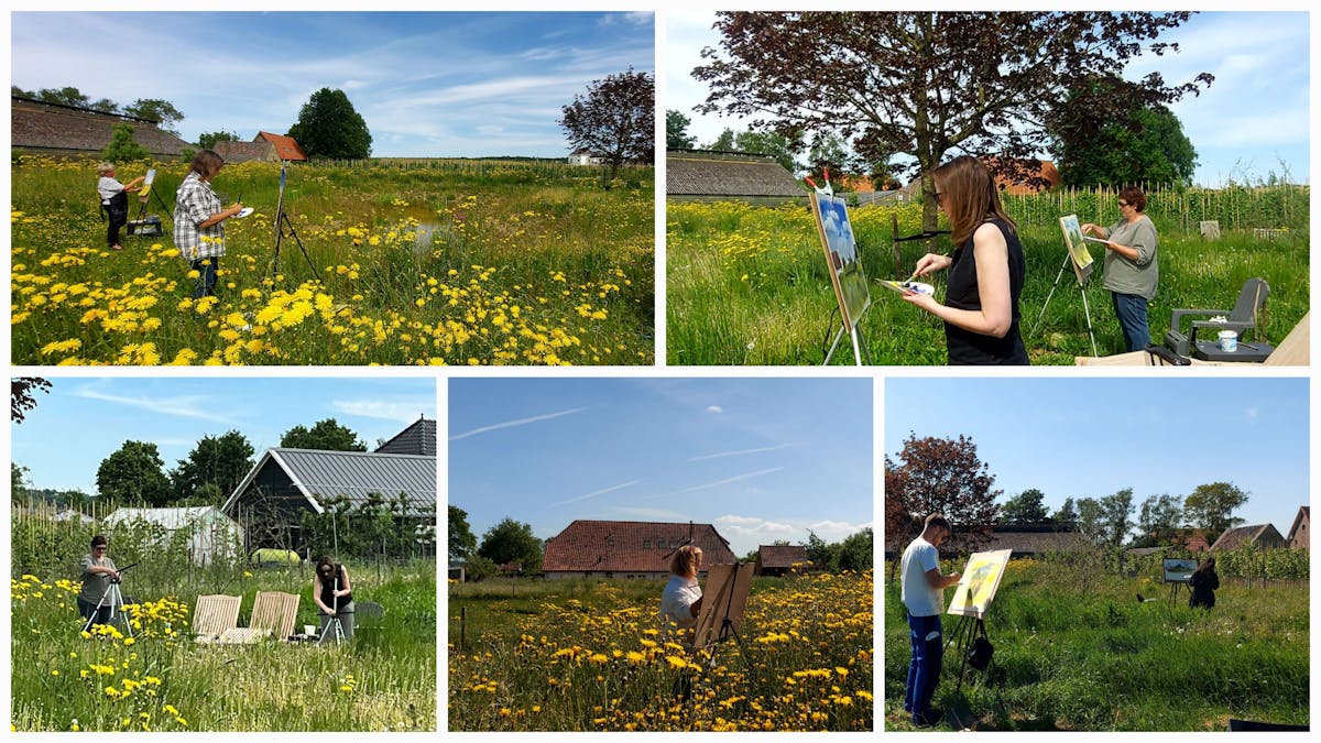 Zet je schildersezel in de boomgaard of tussen de veldbloemen in het weiland. Bij minder goed weer schilderen we in het sfeervolle atelier met zicht op de boomgaard en het weiland.