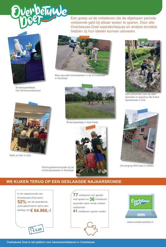 In oktober vielen de Overbetuwe Doet waardecheques op de deurmat. Tot 18 november konden de cheques ingezet worden. Er werden waardecheques van €6,- verstuurd waarvan 52% ingezet is. Dat komt overeen met een waarde van € 64.968,-. Bij het bepalen van de waarde van de cheque houden we er rekening mee dat maar een deel wordt geactiveerd.