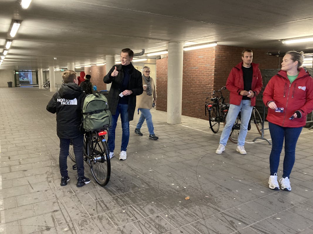 Scholieren van het Lyceum Elst die in de ochtend wél met goedwerkende fietsverlichting op school arriveerden en deze ook hadden aangezet (!) werden door Wethouder Wijnte Hol van de gemeente Overbetuwe samen met medewerkers van het promotieteam van Smile Promotions toegejuicht. Ze ontvingen een kaartje waarmee ze kans maakten op een Bol.com bon van € 75,=.
