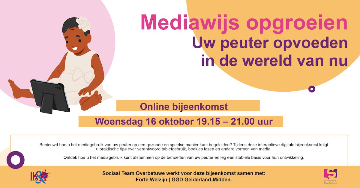 Tijdens deze interactieve digitale bijeenkomst krijgt u praktische tips over verantwoord tabletgebruik, boekjes lezen en andere vormen van media.