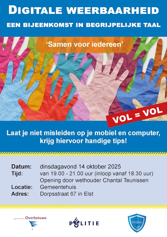 Dinsdagavond 14 oktober 2025 organiseert de Gemeente Overbetuwe -net als vorig jaar- een interactieve en informatieve bijeenkomst samen met de digitaal wijkagent en ervaringsdeskundige Lieke Derksen. Ook tijdens deze avond is de presentatie weer in deskundige handen van Maarten Keijzer van #Blueprofessionals.